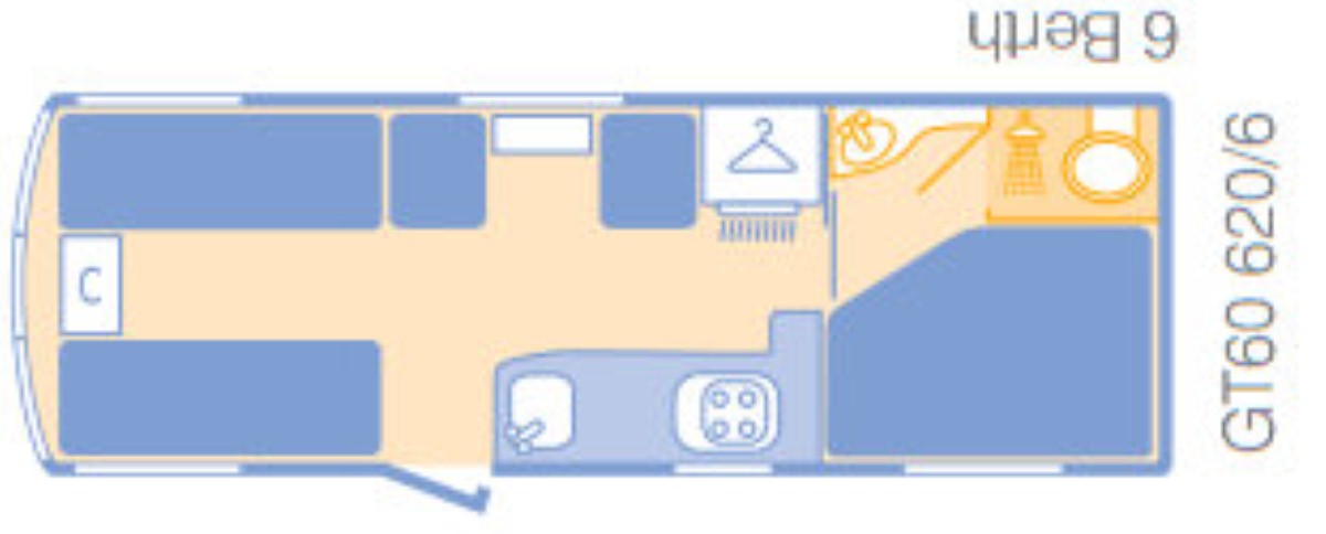 A light-weight tourer for its size, the 620/6 is built upon an Al-Ko chassis and also comes with an Al-Ko AKS 3004 stabiliser and shock absorbers. Alloy wheels and low-profile tyres give it a sleek look, while piped music comes from a quality branded stereo with dual cone speakers.